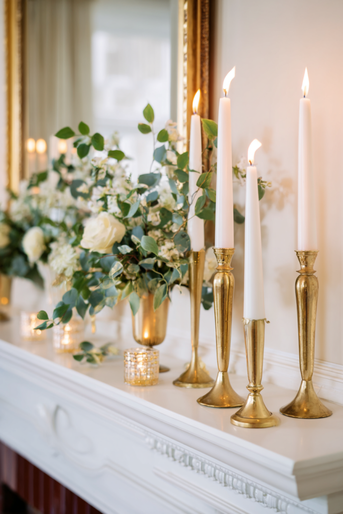 Brass candlesticks and white taper candles? It’s a combo that never really goes out of style. The warm brass feels classic, while the white candles keep things bright and simple.