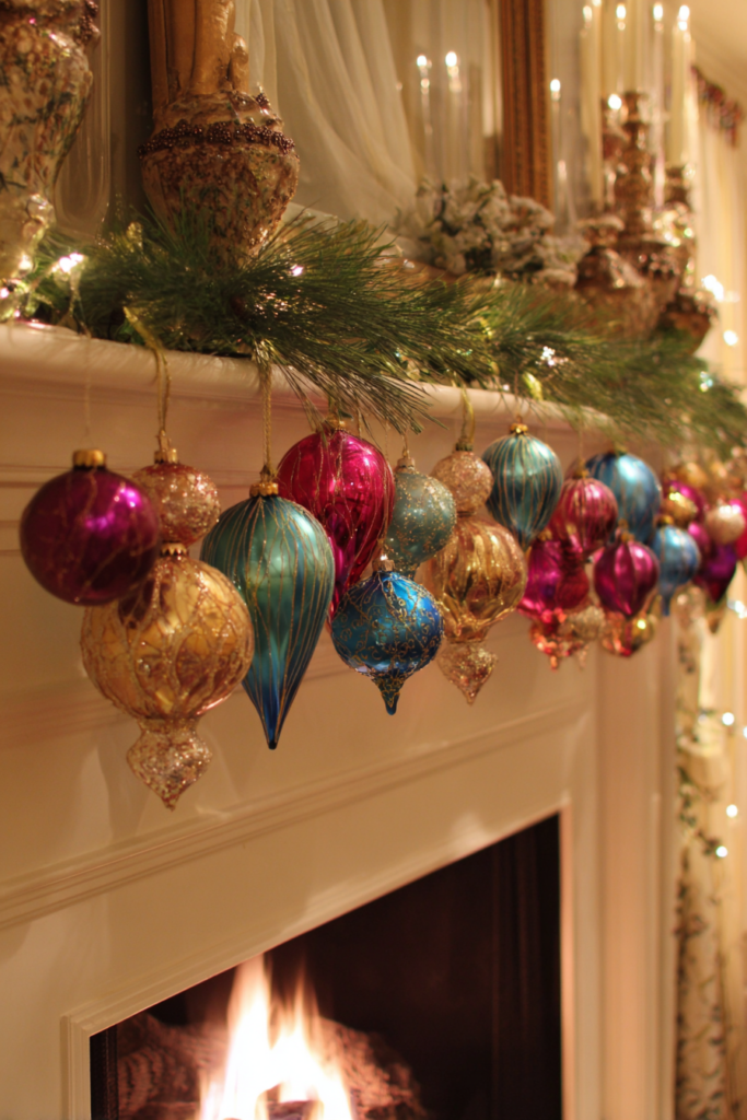 4) Colorful Hanging Ornaments from the Mantel Edge