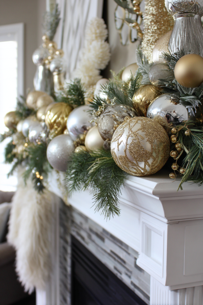 This trick adds color without crowding your mantel. Pick ornaments that match your color scheme, and mix up the sizes and finishes for extra personality.