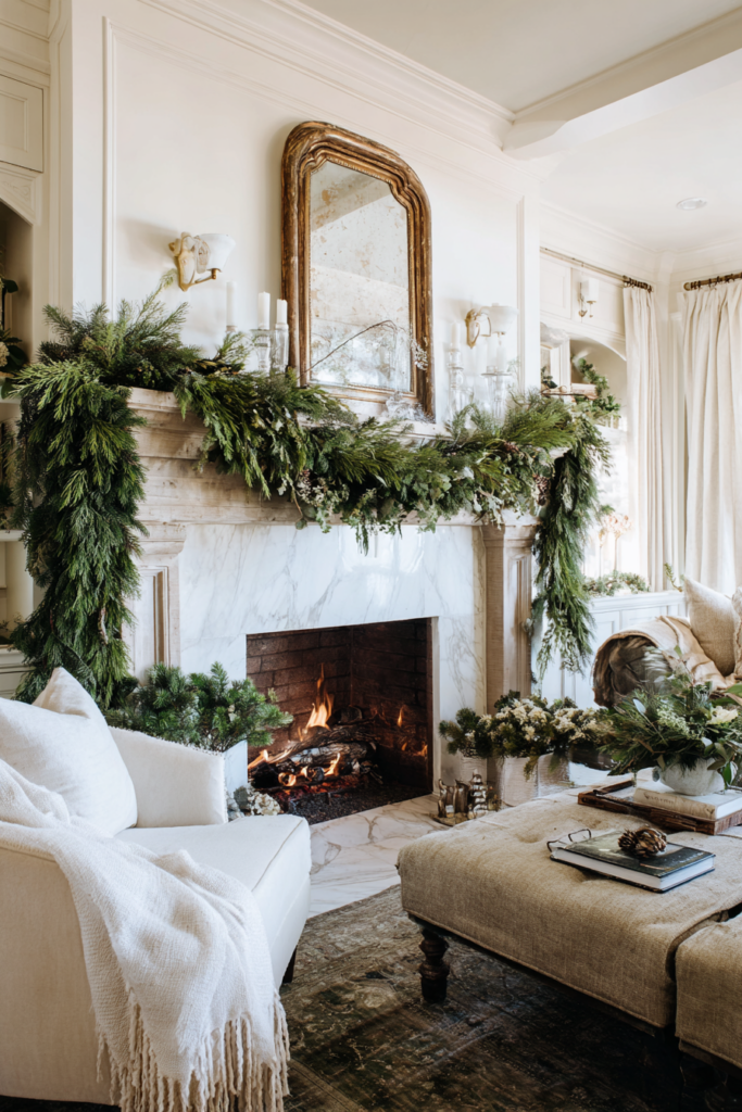 Start with a garland—fresh or faux—draped along the mantel edge. Real greenery like pine, cedar, or eucalyptus adds texture and even smells good.