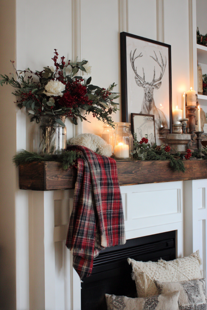 Layer your plaid throw with garlands or ornaments if you want. It’s the foundation that ties everything together and makes the whole fireplace area feel welcoming for guests.